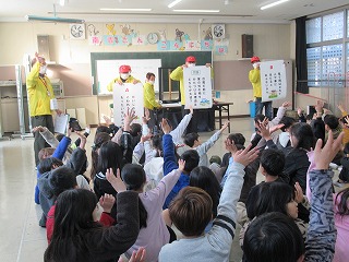 台風や大地震がおきたときに、とるべき行動を紙芝居やクイズで学びました。