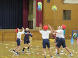 同時にボールを投げて、隣の子がキャッチするゲームでは、チームで息を合わせてボールを投げていました。